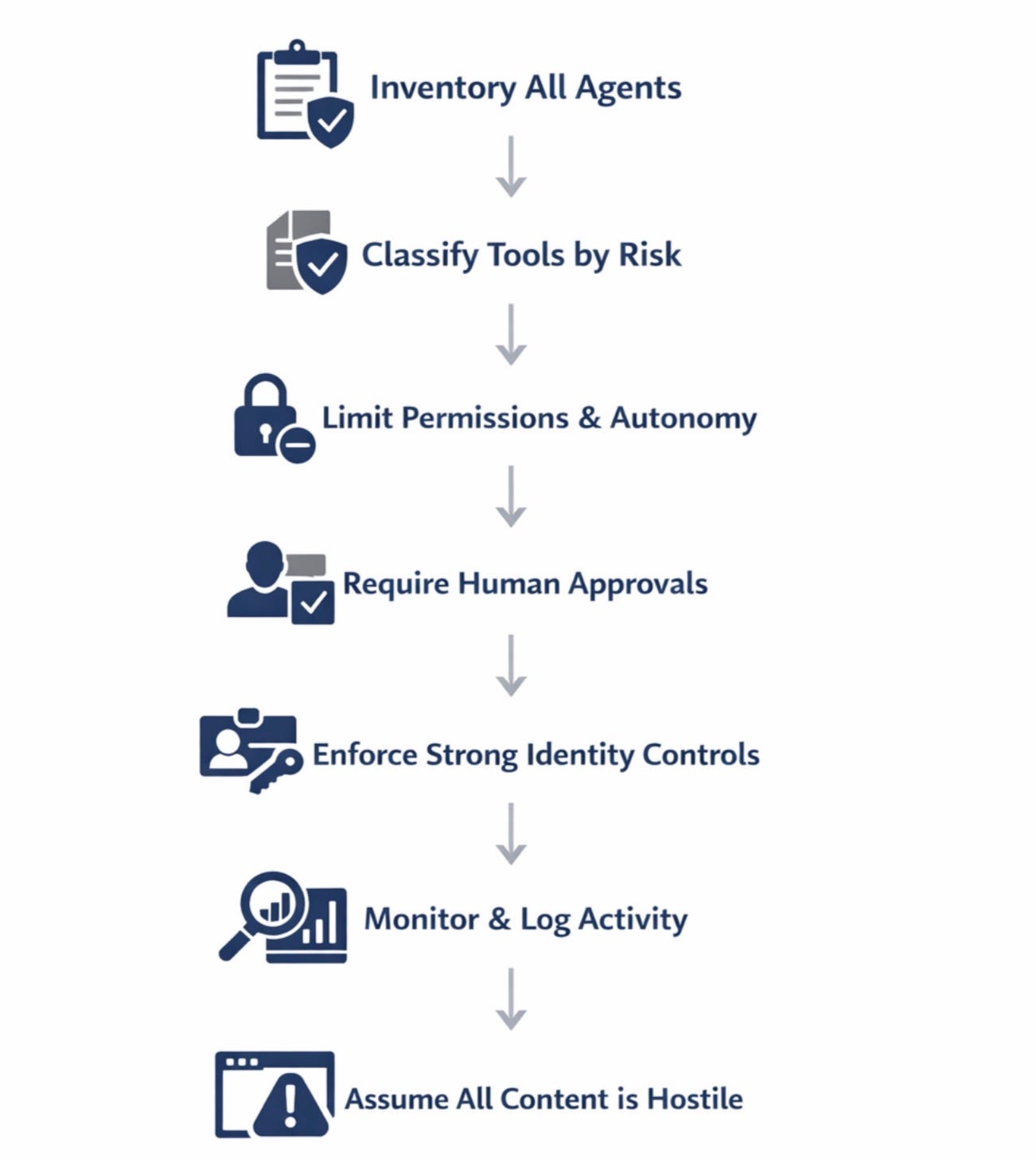 Strengthen identity management by treating agents as non-human identities with unique credentials that can be quickly revoked if needed. Maintain comprehensive monitoring and logging of all agent activity, including tool usage, goal changes, privilege escalation, and any unusual behavior. Finally, operate with the assumption that all connected content, whether from web pages, documents, emails, APIs, or even other agents, may be malicious and design safeguards accordingly.