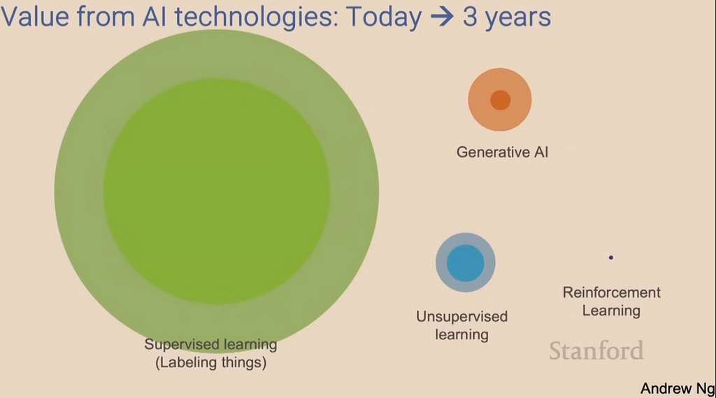 However and despite the hype, “traditional” AI in terms of supervised and unsupervised learning will remain predominant.