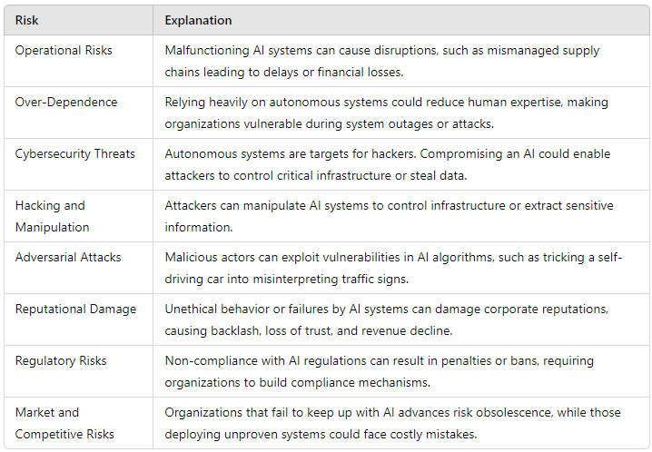 1. Operational Risks: Failure Scenarios: Malfunctioning AI systems can cause operational disruptions. For example, an agentic AI in logistics might mismanage supply chains, leading to delays or financial losses.
