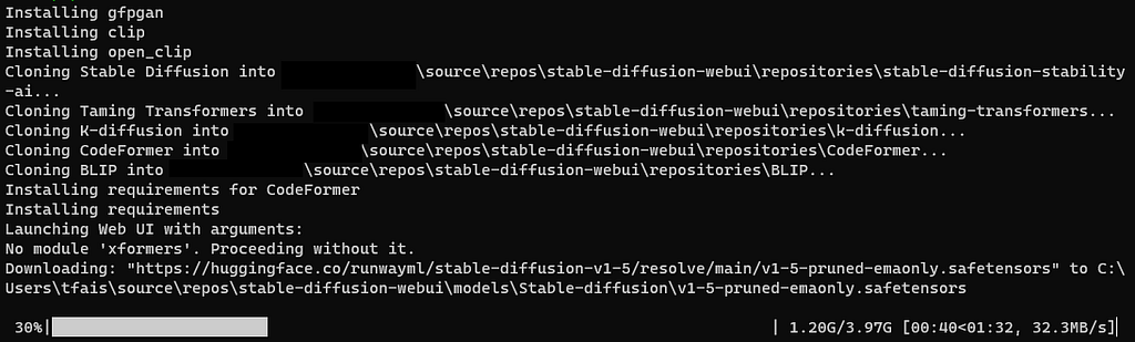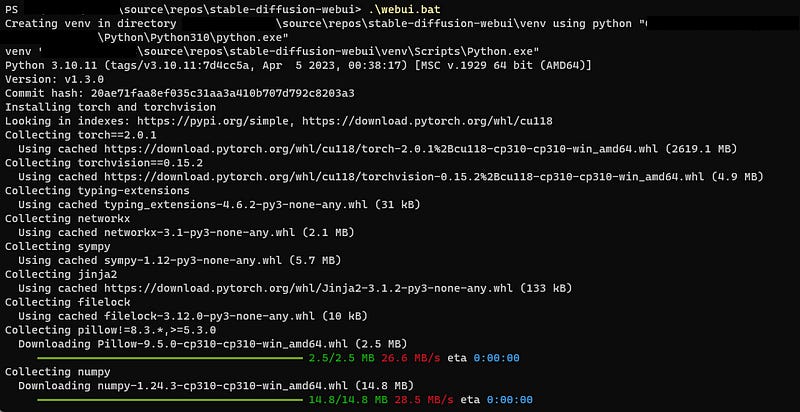 .\webui.batThis script will download all missing packages and components (including PyTorch). Depending on your internet connection, this may take a while (> 5 GB of data to be downloaded for the first time).