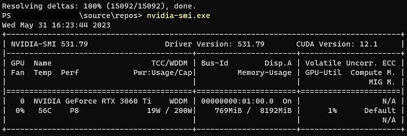 nvidia-smi.exeThe output of this command gives you some information about the GPU and your CUDA version in the upper right corner.